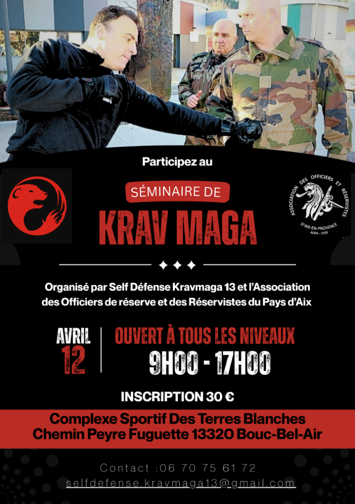 Ce stage d’initiation et de révision, coorganisé par Self Defense Krav Maga 13 et l’AORA (Association des Officiers de Réserve et des Réservistes du Pays d’Aix), poursuit un double objectif :